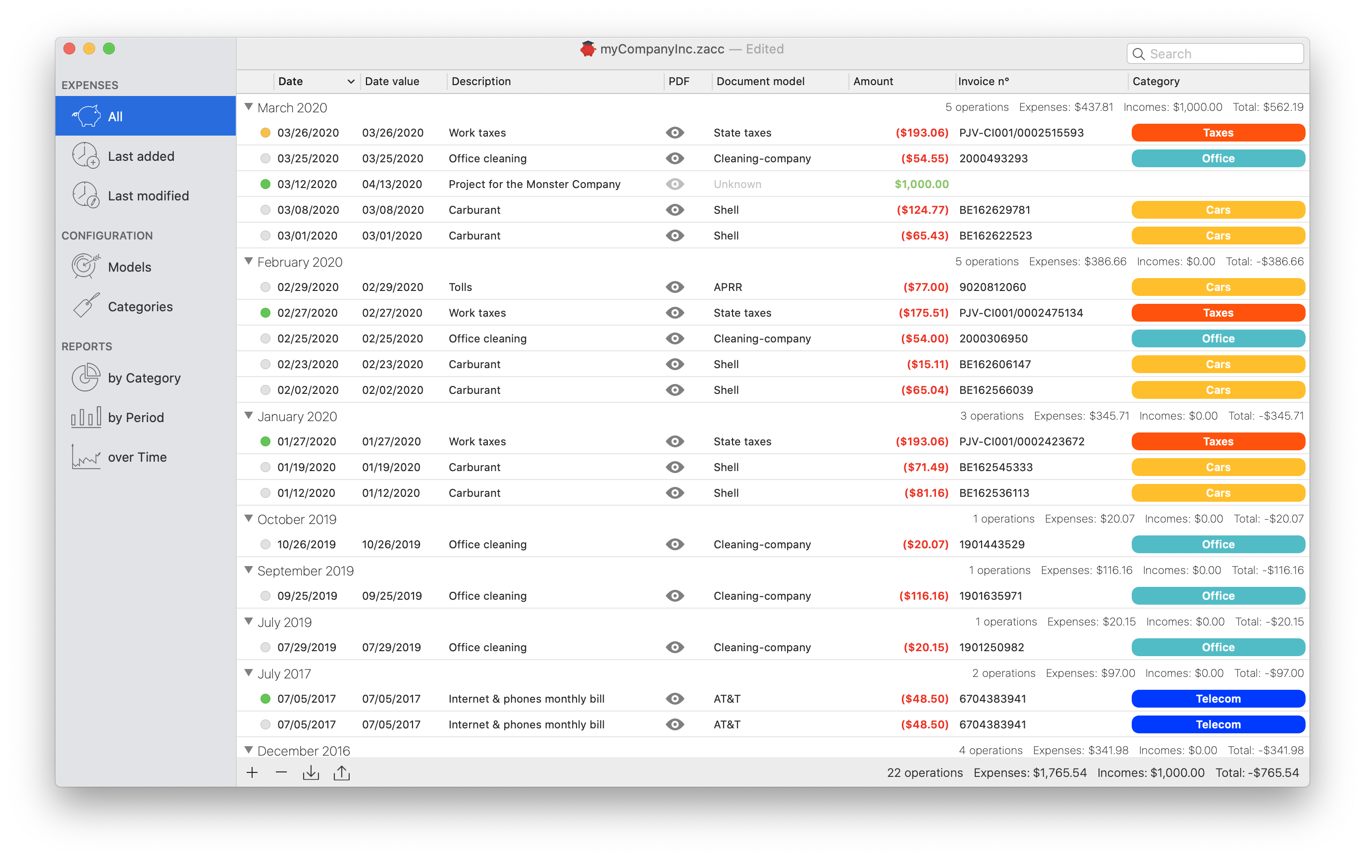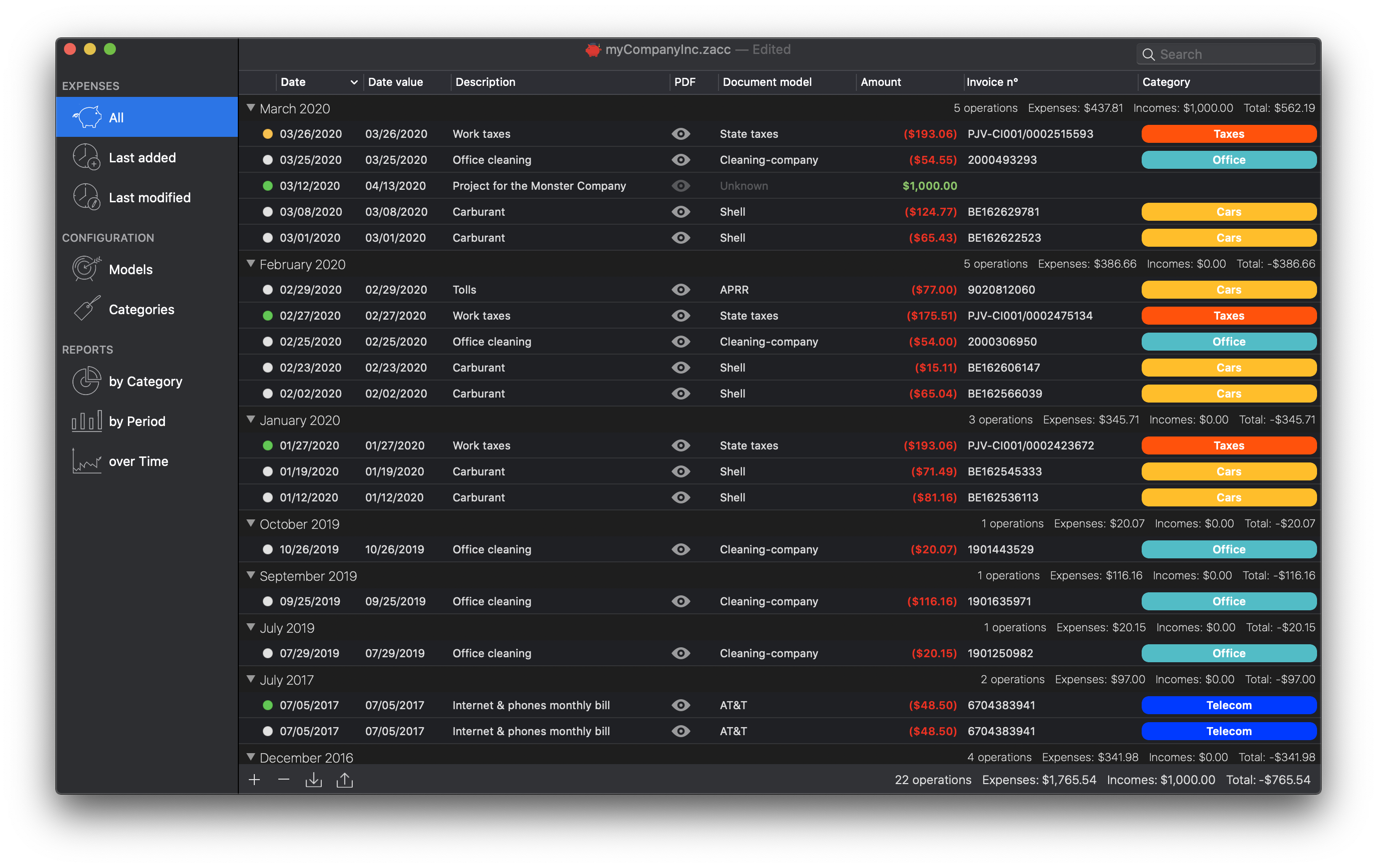 Zacc helps you to automatically track your expenses. Creation is automatic, you just have to consult/search/sort your expenses & incomes, and generate beautiful reports. Let your management shine with Zacc :-).