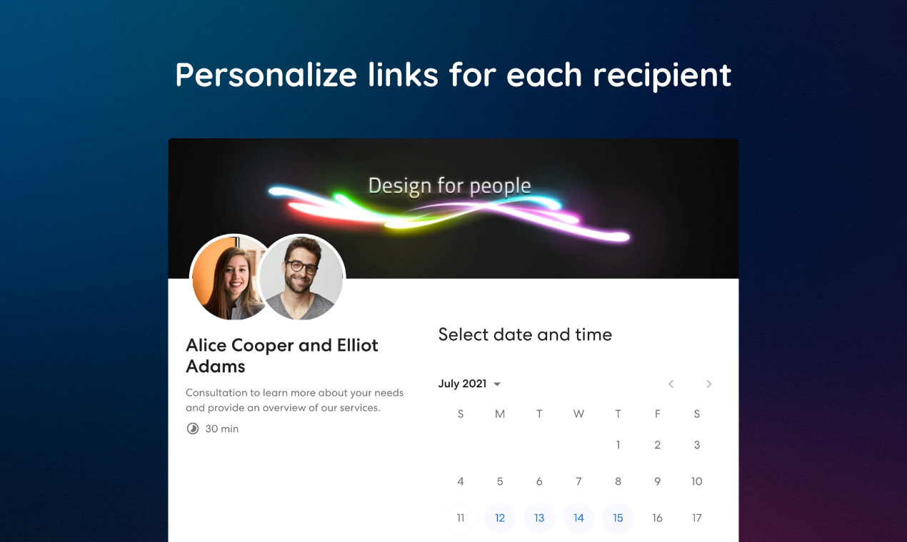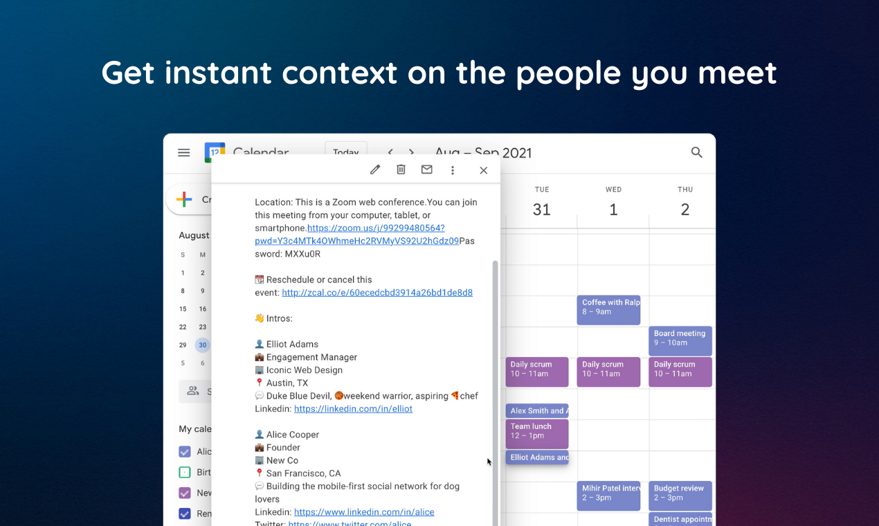Say goodbye to cold, impersonal scheduling links. Use zcal to create beautiful, personalized booking pages that make a great first impression on your guests. It's 100% Free Forever ? ! ? Unique zcal features - Get instant context on the people you meet with a personal intro - Brand your page with a cover photo - upload your own or select from 1M+ Unsplash photos - Showcase yourself with a welcome video that gets people excited to meet you - Personalize links with your recipient's name, email, and profile picture - Share your link as an animated gif or formatted email text - Coordinate large group meetings with meeting polls (you can finally ditch Doodle!)