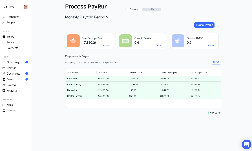 Give your people a platform Create can-do culture with a modern employee platform built for growth. _________________________________________________________________________ Not another HR tool We rebuilt the employee stack from the ground up to empower people at work. Pay, benefits, apps, laptops, time off, feedback and more. Everything your employees need in one place. _________________________________________________________________________ People-centric Create a world-class employee experience by building your systems and processes around your team, not tools. Don’t make people jump through hoops to get the resources and support they need and create positive touch points that drive engagement. Enabling People operations is about enabling your team’s creativity through tools and resources. Pay, benefits, software, hardware, time off, feedback, and more - as simple as drag and drop. Remove hierarchy and allow employees to self-serve and get approvals seamlessly. Automated Fuse people ops silos across HR, IT and finance to create an automated mission control room. Get more done and reduce stress from working late by wasting less time on simple computer admin tasks. Data-driven When all is organised - your visibility horizons widen. Connect all your productivity tools to Zelt and understand better how your team works, give more relevant feedback and encourage data-driven decision making. Simple Simplicity, success and customer delight go together because, when you keep things simple, they tend to be robust and people are able to focus. Less goes wrong, and there is less to maintain and get distracted from. Remove distraction using fewer better tools and simpler processes that promote reliability, good decision making and lots of up time.