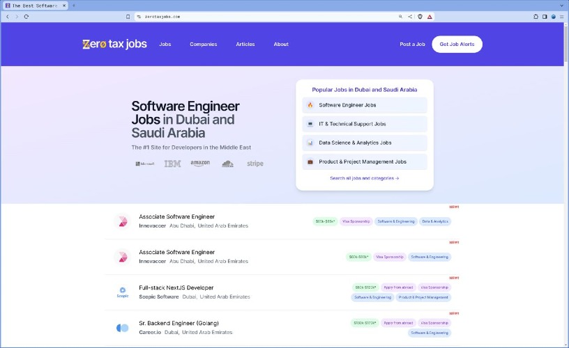 Zero Tax Jobs is a job board dedicated to tech jobs in the Middle East - primarily for English-speaking software engineers seeking work in Dubai, UAE and Saudi Arabia. Here you’ll find hand-picked tech jobs at globally minded companies and leading startups in the region. Most positions provide visas, welcome applications from abroad and very few require Arabic skills. We post vetted positions that offer a positive work environment for expats and international software programmers. If it doesn’t meet our high standards we won’t post it - in fact, we only post 5% of the roles we receive. So if you want to work in the United Arab Emirates or Saudi Arabia but avoid the negative parts of the Middle East’s work culture, this is the job board for you.