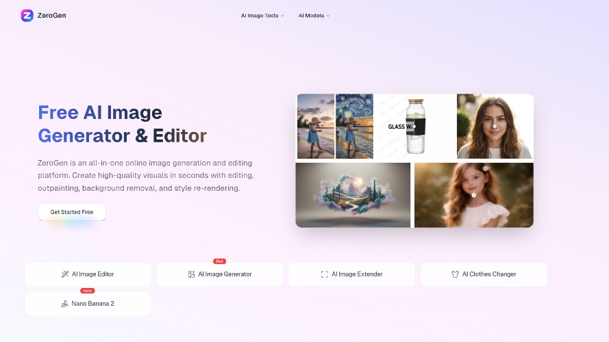 ZeroGen is an all-in-one online platform for image generation and editing. Create high-quality visuals in seconds with powerful tools like editing, outpainting, background removal, and style re-rendering.
