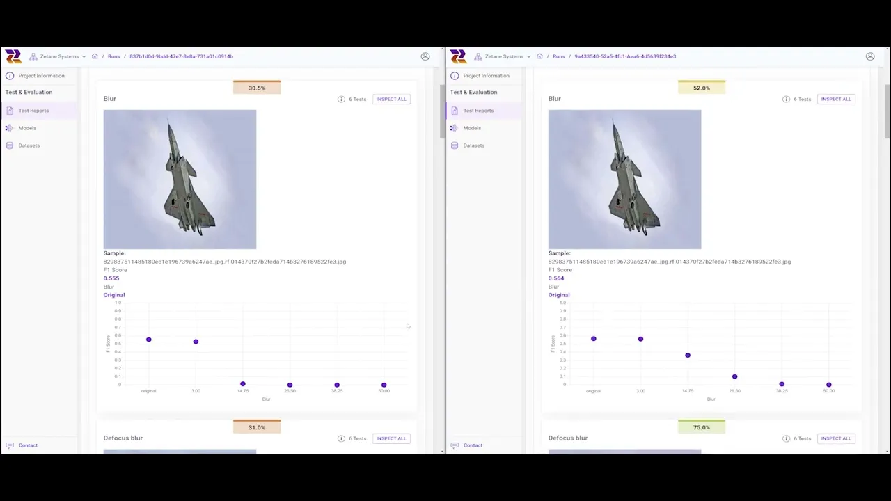 Zetane Protector: Ensure reliable and robust computer vision Try our online platform to get the most extensive testing of your computer vision technology for robustness and reliability. Zetane Protector validates that a computer vision solution is reliable by testing for over 100 compromised operating conditions due to factors like mechanical malfunctions or poor weather. Once you know the vulnerabilities of your AI solution, you can augment your training dataset with images representative of that vulnerability and retrain your model so that it is robust and maintains high performance when encountering that vulnerability in real-world operating conditions.