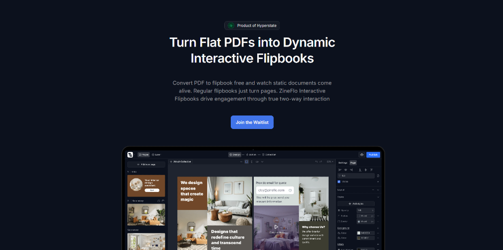 ZineFlo is a free tool that turns your PDF into an interactive flipbook. Add buttons, forms, videos, and more to make your content engaging. It’s easy to use, works on all devices, and has no watermarks or sign-up required.