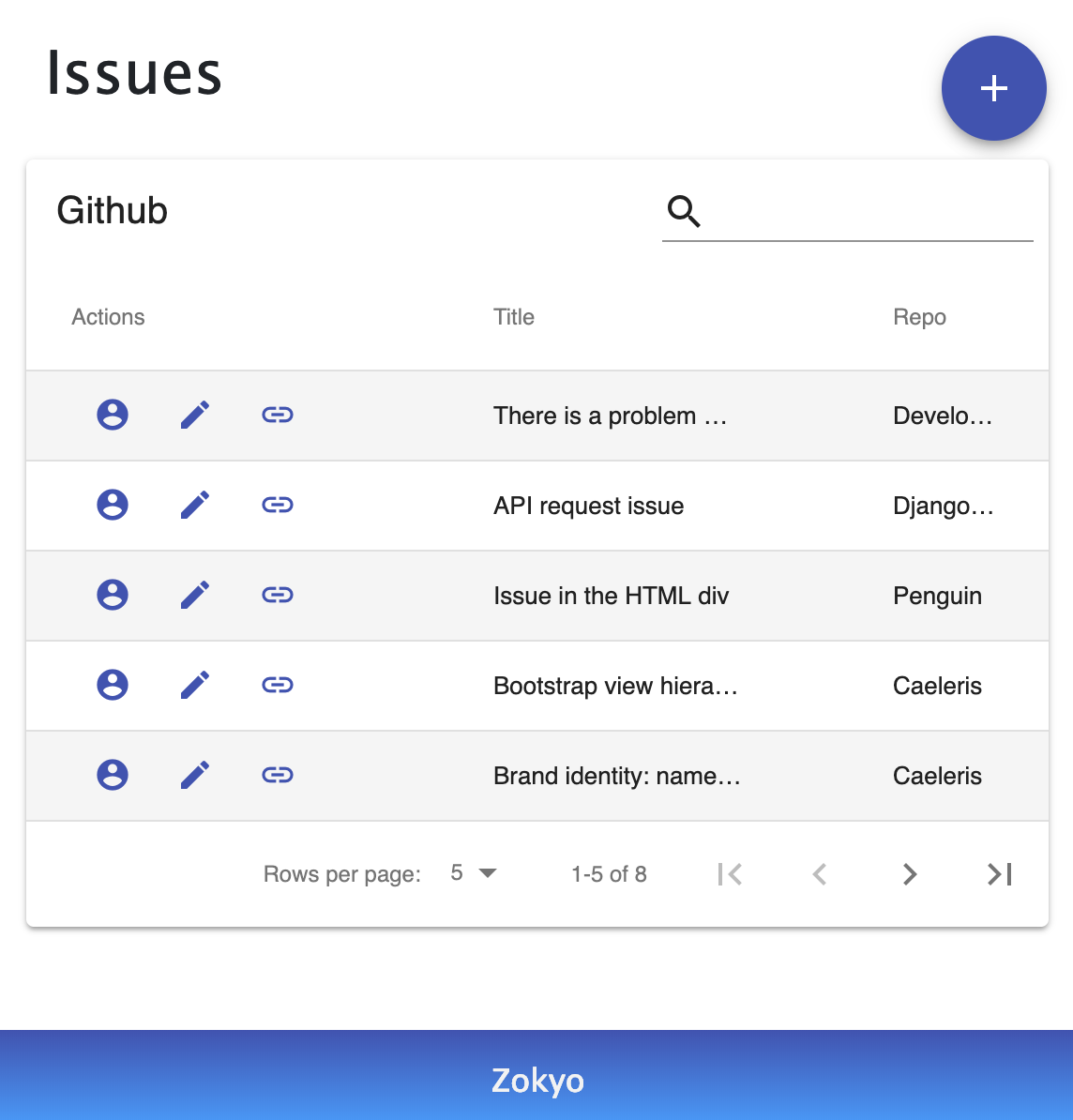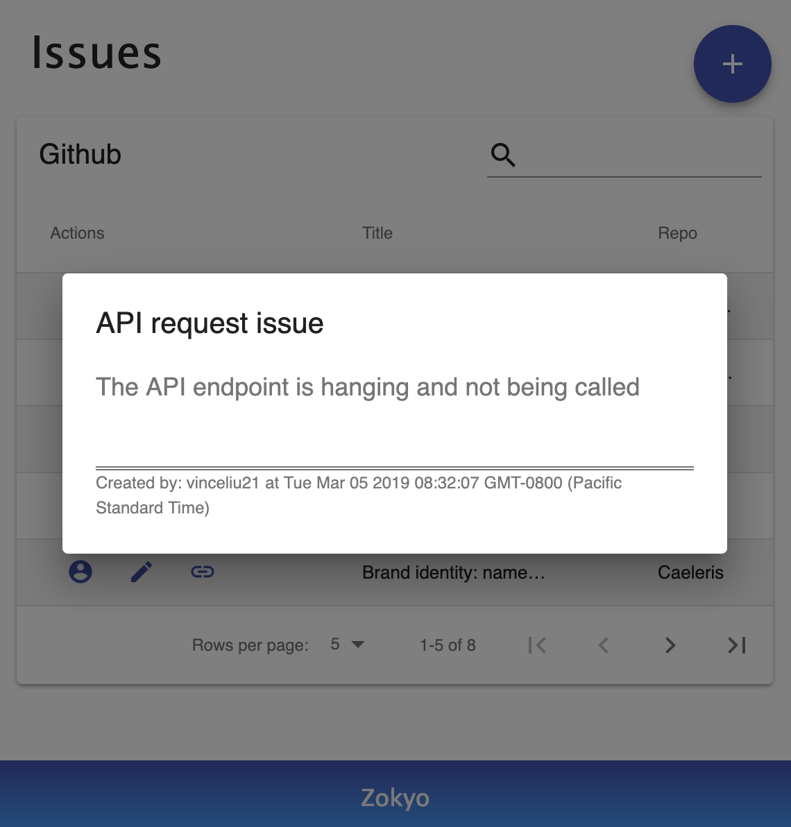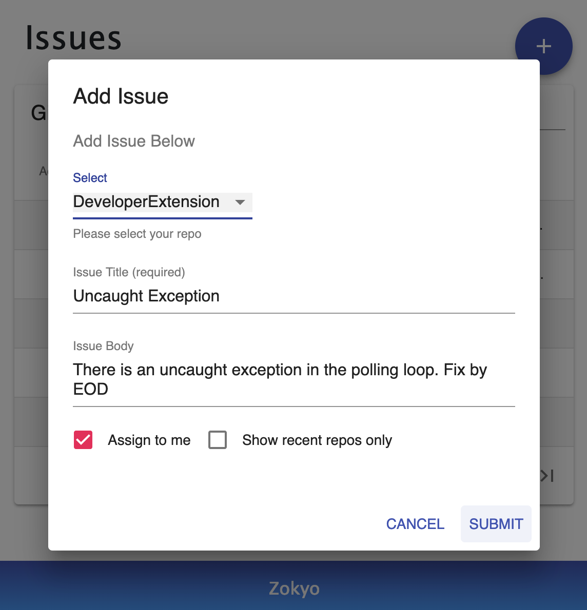 Zokyo is a free to use chrome extension for GitHub developers. It allows you to view all your assigned issues, edit any issue, add new issues to your repositories, and go to each issue from one simple UI that you can access from any webpage. As a developer myself, I got frustrated having to tab hop between ticket windows and my work. I wanted an easier way to see what I had to work on for the day. Since I always use chrome, I thought a chrome extension for a GitHub issue management dashboard would be great. I've called this project Zokyo. You can download the extension for free at https://chrome.google.com/webstore/detail/zokyo/niagnllbhlhbiafjlobjindndghoooab Or watch a video of the extension in action here https://www.youtube.com/watch?v=5gF2GDbqOCM I always welcome feedback, so if you have any comments, feature requests, questions, or just want to chat in general, then you can email me at [email protected] Hope this tool helps developers out there and any/all feedback is appreciated! Thanks!