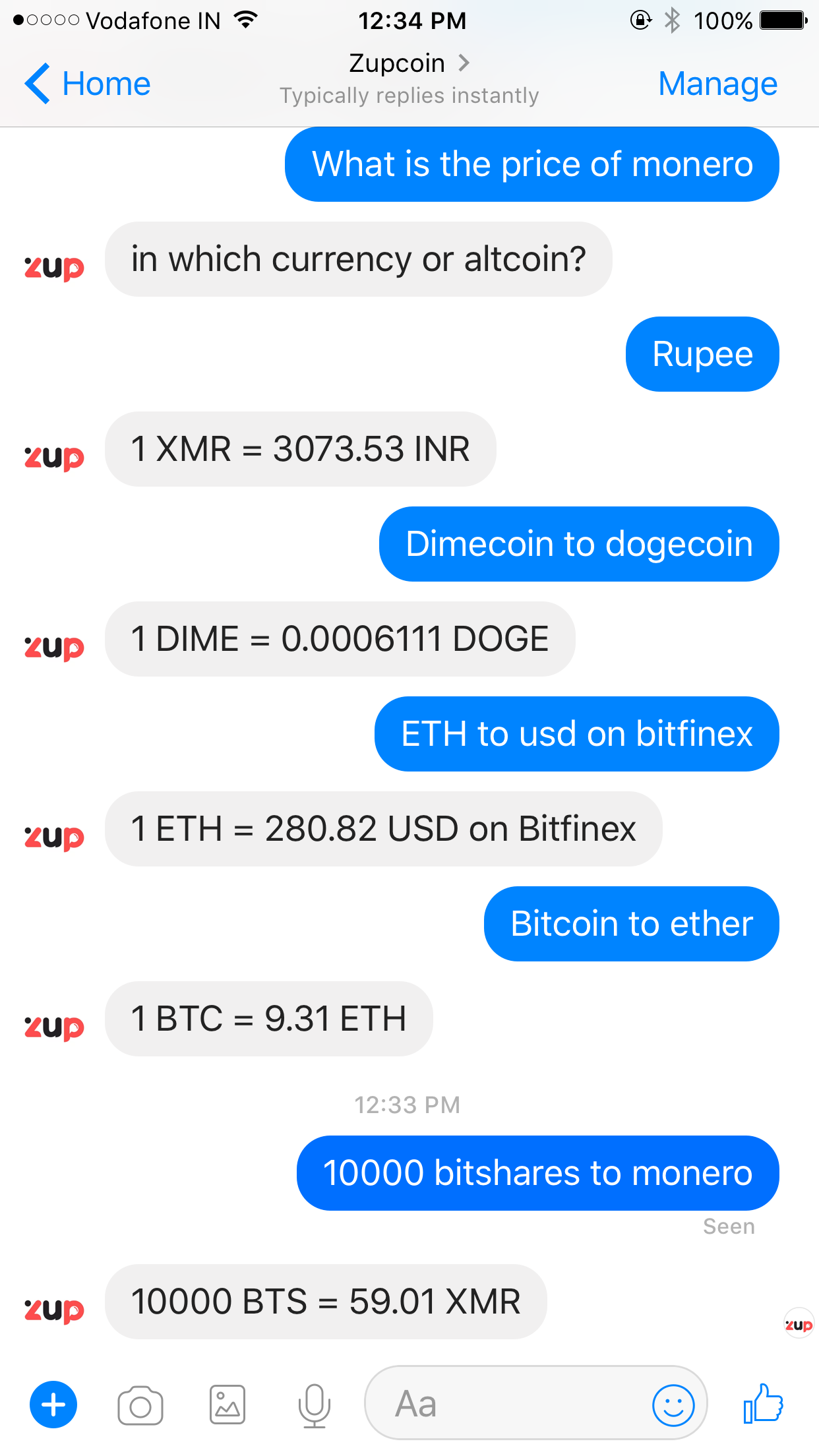 Zupcoin is the ultimate cryptocurrency bot that lets you get the price of any coin in terms of any other coin on any exchange. List of supported exchanges: Bit2C BitBay Bitfinex bitFlyer bitFlyerFX BitMarket Bitso BitSquare Bitstamp Bittrex Bleutrade BTC38 BTCC BTCE BTCMarkets BTER BTCXIndia CCEDK Cexio Coinbase CoinCheck Coinfloor Coinone Coinse Coinsetter Cryptopia Cryptsy EtherDelta EthexIndia Gatecoin Gemini HitBTC Huobi itBit Korbit Kraken LakeBTC Liqui LiveCoin LocalBitcoins Luno MercadoBitcoin MonetaGo OKCoin Paymium Poloniex QuadrigaCX Quoine TheRockTrading Tidex Unocoin Vaultoro Yacuna Yobit Yunbi List of supported coins https://www.facebook.com/zupcoin/posts/1206480842791837