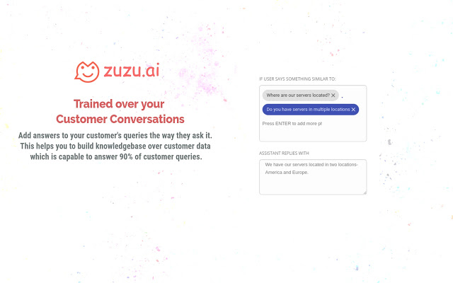 Zuzu, An Intelligent and Knowledgeable AI assistant for Teams Hi, I am Zuzu, An Intelligent assistant for Teams Improve customer experience by delivering information when and where your team needs it. **Improved Customer experience** Boost your customer experience with our AI assistant for teams which provides the consistent and accurate answer to customer queries. **Increase Team's productivity** Repetitive questions can eat up your agent’s valuable time. Let an AI assistant help your agents answer customer FAQs and close leads faster. **Improved Customer Satisfaction and Sales Velocity** Zuzu reduces the time it takes to respond to customers by up to 65 percent, ultimately improving customer satisfaction and sales velocity. **Trusted and Up-to-date Knowledge for Everyone** Build knowledge-bases based on your product categories. Share team with always updated knowledge, trained over customer data by everyone.