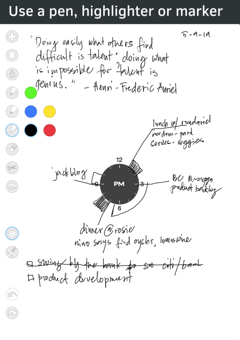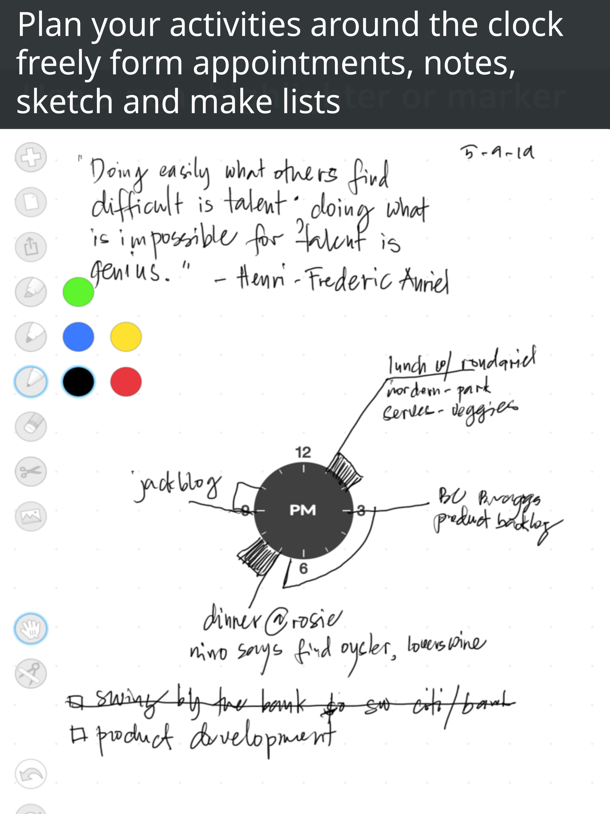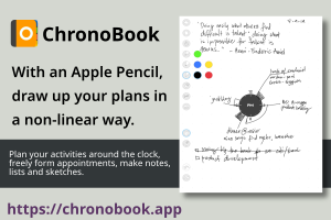 ChronoBook is a minimalist daily planner for iPad and Apple Pencil where each day is represented in AM and PM and you plan your activities around the clock, make notes, sketches and scribbles. It's a day-planner, mind-map and scribbly notes all in one. --- Typical day planners have lost the freedom to express yourself, by trying to define your life in small boxes, but life does not conform on boring lines of a grid on the typical day planner, our lives is not always contained in a grid. We will always have to write something outside the lines. There's never enough space for your life. Enter ChronoBook: This day-planner bravely remove all the rigidity of a typical day-planner have and start fresh with an idea. It frees up clutter typical of daily planners, by embracing the analog notion of representing time by putting an analog clock in the middle of the page. The clock occupies just a small amount of space, where you can plan your activities around the clock, make notes, sketches and scribbles. The rest is completely flexible. Each page represents either AM or PM, and you write your plans like a dial of a clock, it is very easy, simple, but yet effective. Focus on the individual tasks of the day, rather than being forced to engage with every calendar day. It's intuitively organized, it's the simplest clear definition of what a day planner is all about. Like an analog clock, the relationship between projects and tasks gives you a sense of better control of the time, and easily visualize allotment of time and how relates in the day. And there's something special about seeing your plans layered out in the wheel and how it relates to your day. It gives you a sense of better control of your time. This is the only planner you would need!