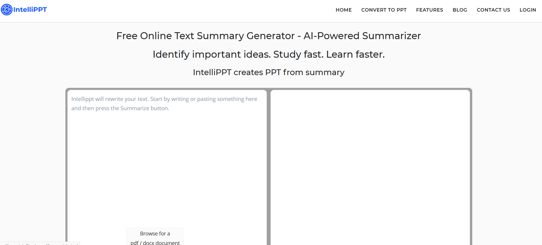 IntelliPPT summary tool generator helps in creating the synopsis of the provided paper automatically within seconds. The only thing you need to do is copy and paste your text or upload your text to our summarizing tools. The article summarizer tool delivers instant results, which indicates less effort and more time-saving.